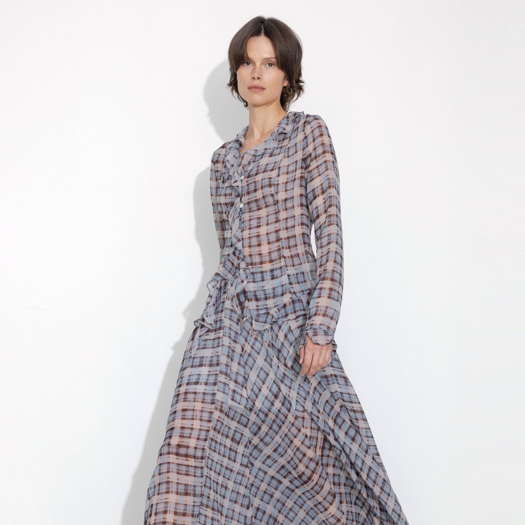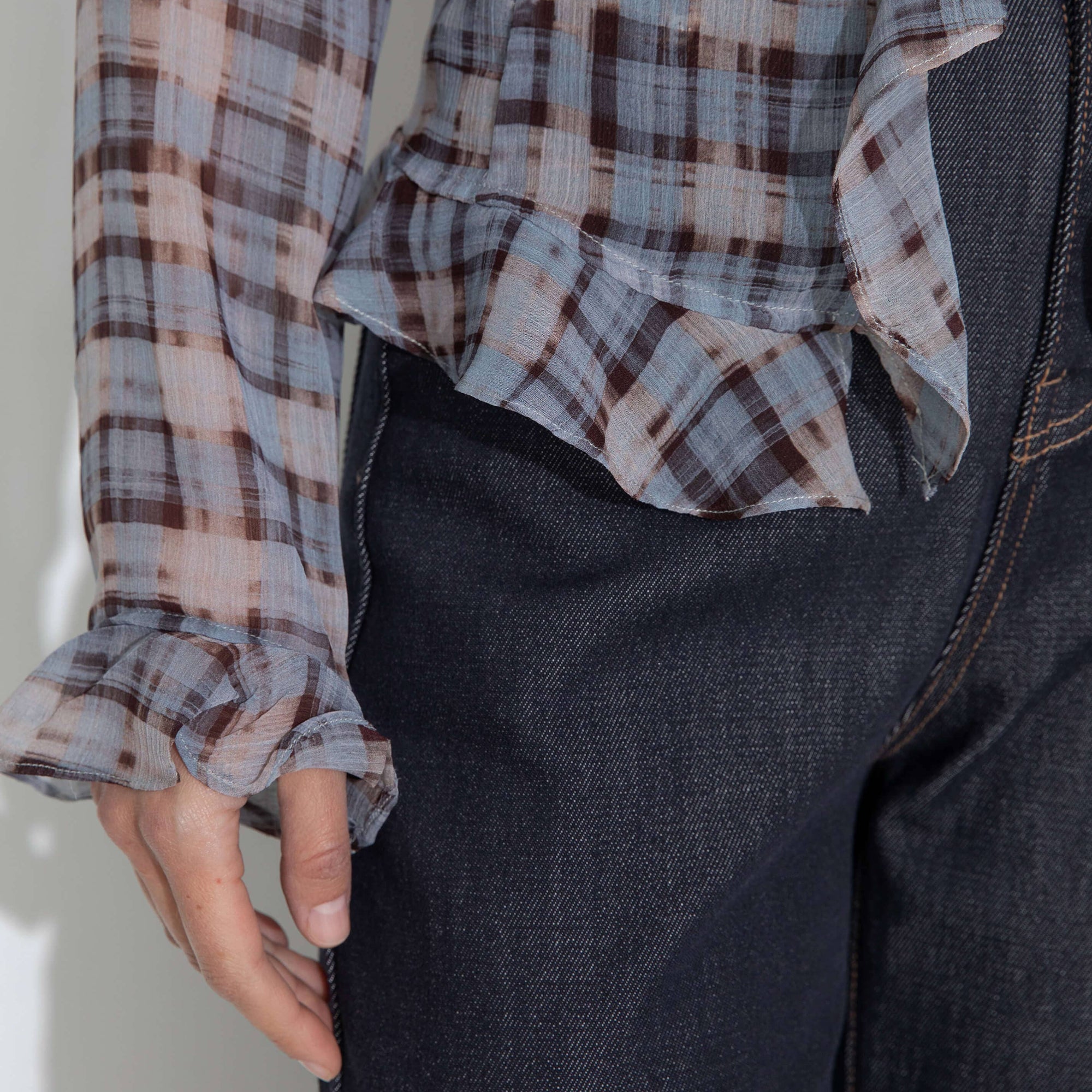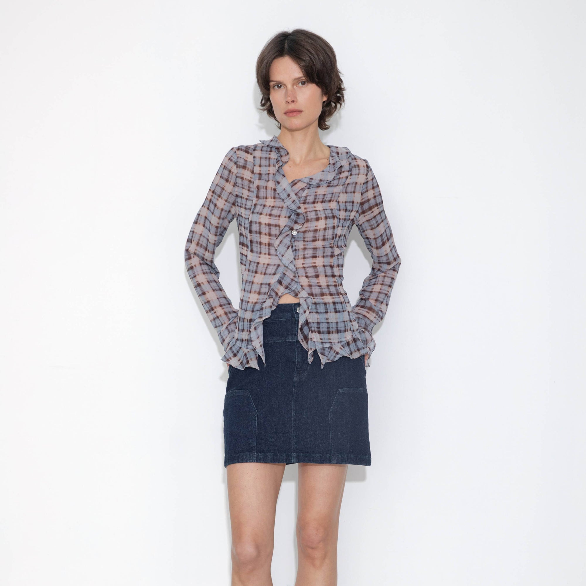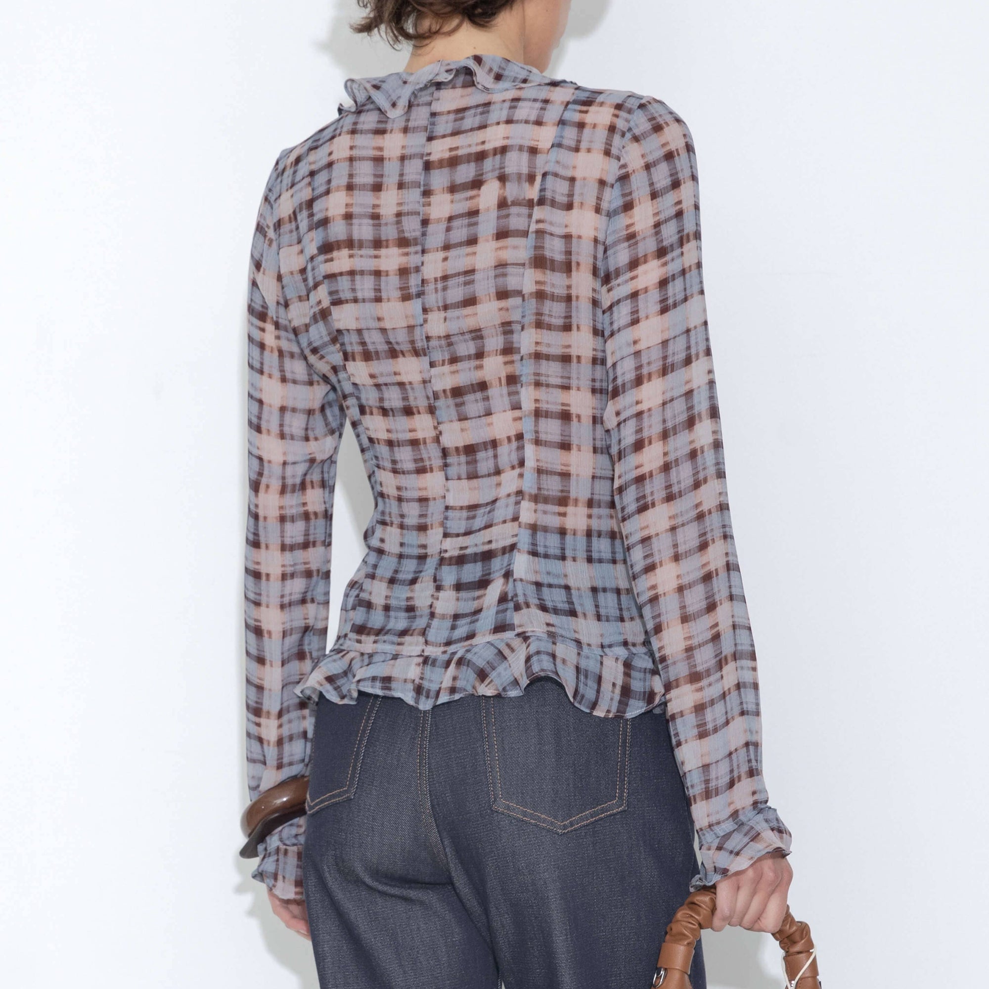 Semi-Sheer Ruffle Trim Check Shirt: Blue